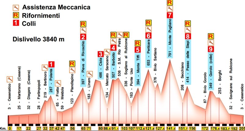 La Nove Colli es la QH italiana. Con salida y llegada en Cesenático (el pueblo de Marco Pantani, situado en el costa de la Emilia Romagna) tiene 205 kilómetros y 3780 metros de desnivel. No se suben grandes puertos, realmente el punto más alto es el Monte Pugliano (798 metros de altitud), pero es un trazado digno de emboscadas. No en vano su recorrido fue la etapa 12 del Giro de Italia 2020.