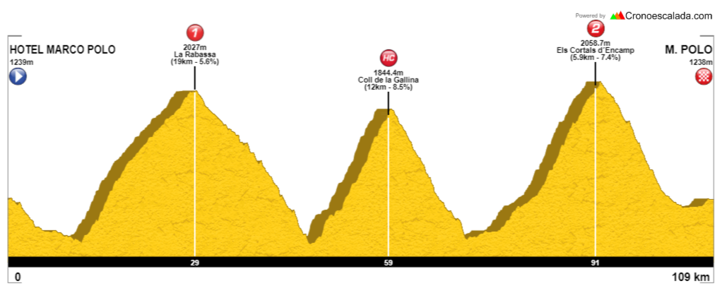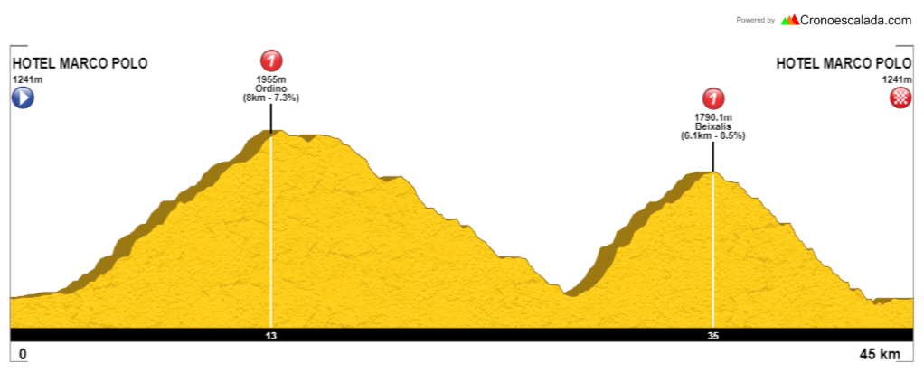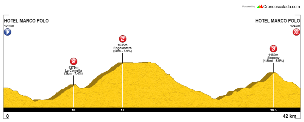 -Prólogo. Jueves 24 de julio por la tarde. Empezamos con un prólogo con olor a Tour. El puerto de Ordino, uno de los más míticos de Andorra. Donde Jan Ullrich hizo una de las subidas más espectaculares de su vida y después Beixalis, donde Valverde no pudo atrapar a Sepp Kuss en el Tour.