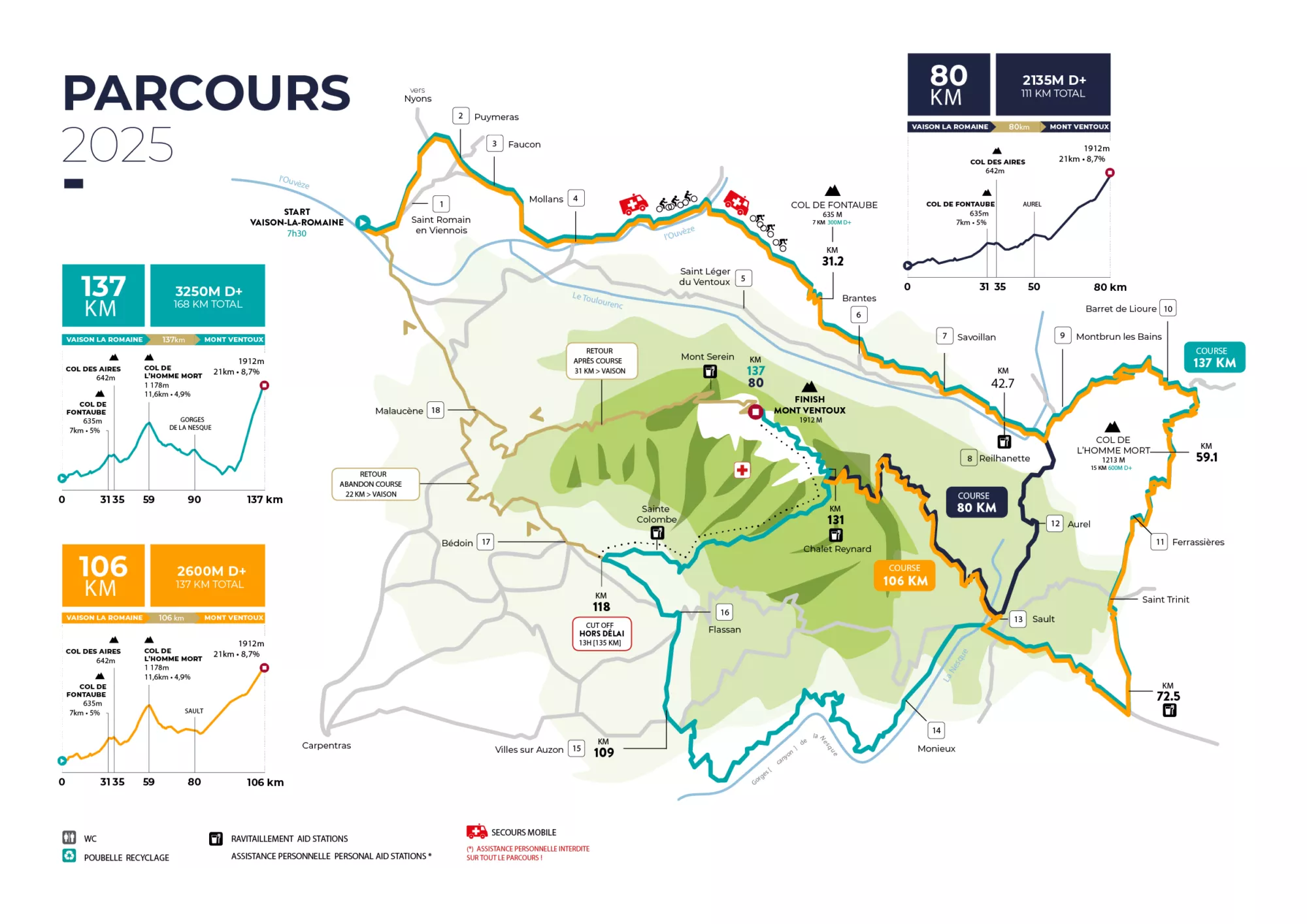 La versión de 106 kilómetros también incluye La Madeleine, pero asciende al Mont Ventoux por la vertiente de Sault, algo más larga, pero con menos desnivel medio. Y al de 80 kilómetros no asciende La Madeleine y también sube el Ventoux por Sault.